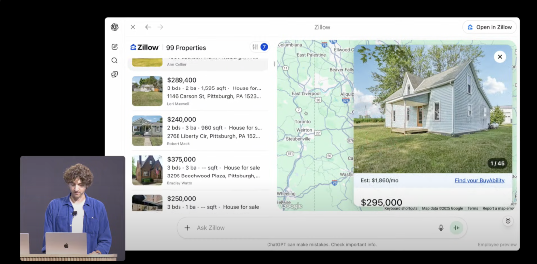 而当业务需要扩张时,ChatGPT会根据上下文建议用户考虑“匹兹堡”这个城市,并无缝唤起Zillow应用,直接扩大到全屏,帮助寻找合适的房源,用户只需要再在ChatGPT内提出新要求,就能让它筛选出“带院子的三居室”。