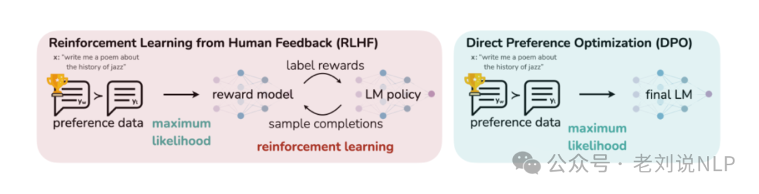 另外,最新的强化,已经从ppo,逐步演化到dpo,可以关注这方面的进展。DPO优化人类偏好,同时避免强化学习。利用人类反馈对语言模型进行微调的现有方法,首先将奖励模型与提示数据集和人类对成对回答的偏好进行拟合,然后使用RL来找到使所学奖励最大化的策略。相比之下,DPO通过一个简单的分类目标直接优化最能满足偏好的策略,而不需要明确的奖励函数或RL。