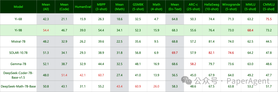 通过深度扩展,Yi-9B模型在多个基准测试中表现出色,特别是在代码、数学、常识推理和阅读理解等领域。这证明了通过优化数据特性和模型大小之间的相互作用来增强模型性能的有效性。