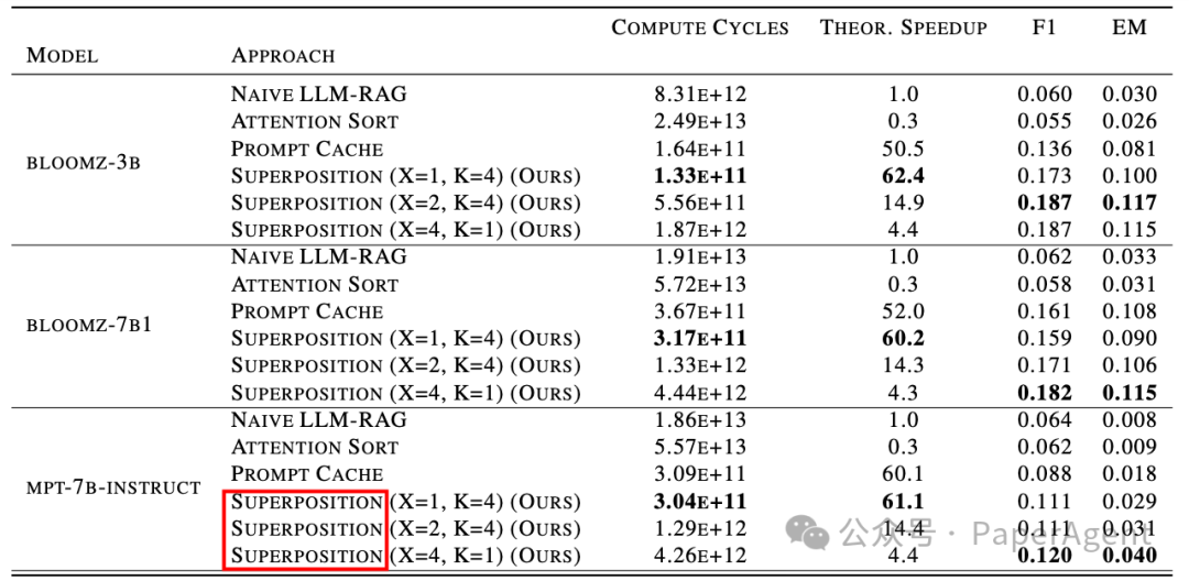 图3在“在线服务”期间必须计算的内隐注意力依赖关系((b)-(f)中的颜色对应于图2中的标记段颜色)。注意各种优化如何通过剪枝、预计算和并行化工作来减轻在线服务时所需的计算负担。值得再次强调的是,在实践中,推理不是对一个大型序列的稀疏注意力,而是对许多不同较短标记段的密集注意力。  实验结果表明,超位置提示在多种预训练LLM上的时间效率和准确性方面都有所提高。特别是在NaturalQuestions-Open数据集上,使用MPT-7B指令调整模型,相比于传统的RAG方法,超位置提示实现了93倍的计算时间减少和43%的准确性提升。此外,还展示了该方法在MuSiQue数据集上的有效性,该数据集是一个多跳推理数据集,旨在使断开的推理变得更加困难。实验结果表明,超位置提示在各种模型和数据集上都能提高长序列建模的准确性,同时减少用户观察到的响应延迟,且无需对基础模型进行额外的训练或微调。在NaturalQuestions-Open数据集上,各种模型和方法的检索增强生成准确性。对于具有超参数的基线——即BM-25、TF-IDF和Contriever的top-k参数——展示了它们最高准确性的配置。超位置提示在准确性和加速两个方面相对于考虑的基线的优越性。 在MuSiQue数据集上,各种模型的检索增强生成准确性。对于超位置提示,t表示迭代超位置的迭代次数,k表示在每一步选择的前k个(即未剪枝的)。