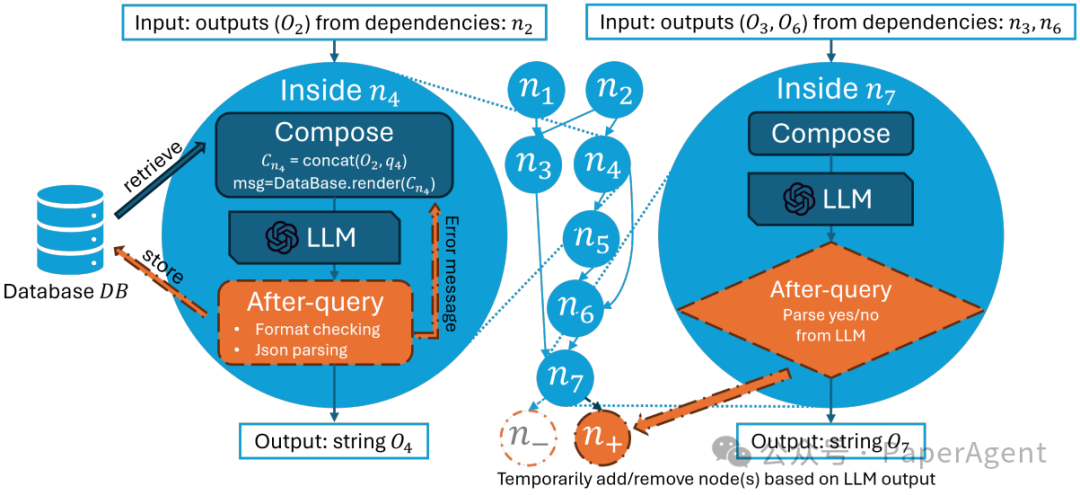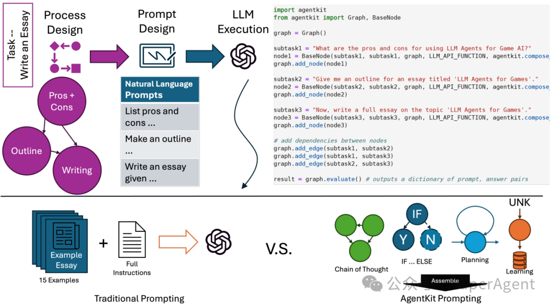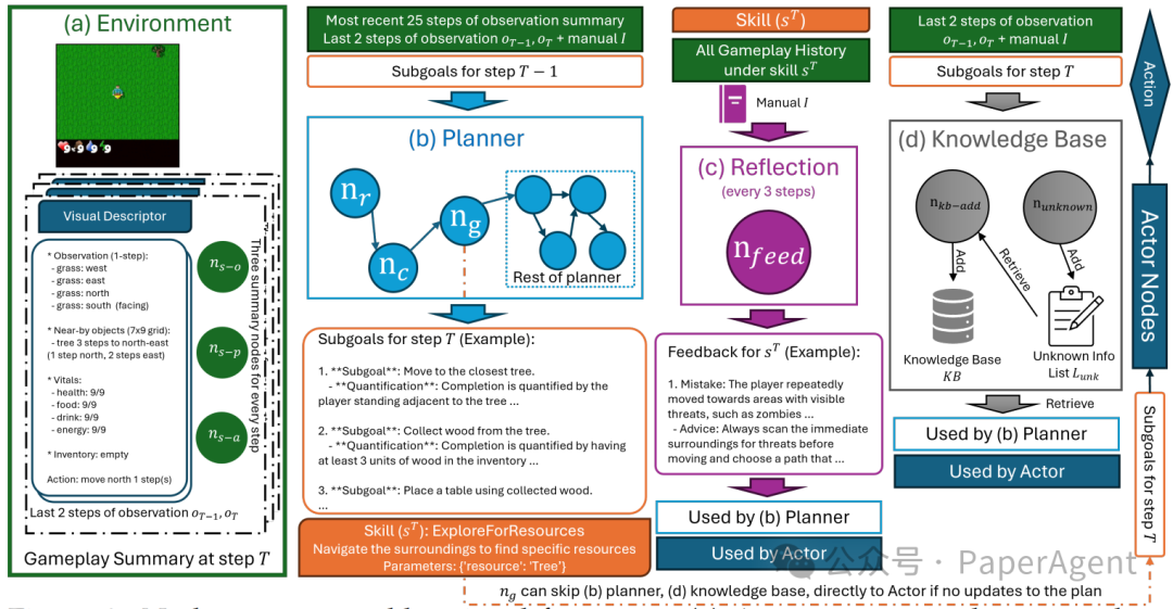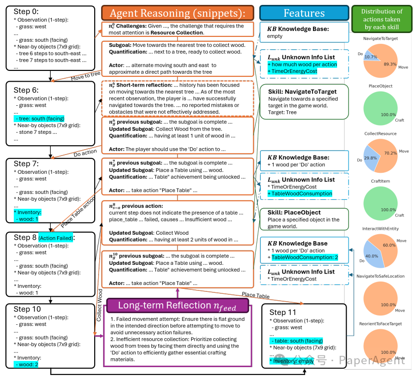 用户将任务分解为代表“思考过程”的子任务(节点),并为这些子任务(节点)创建提示。在AgentKit中,子任务(节点)可以以不同的方式设计和组装,以实现多样化的功能,类似于乐高积木。 为了克服这些挑战,提出了AgentKit并开源,这是一个为组装简单自然语言子任务而设计的LLM提示框架,以解决复杂任务。AgentKit的基本构建单元是“节点”,每个节点包含针对特定子任务的自然语言提示。用户可以将这些节点串联起来,形成节点链,以明确实施一个自然结构化的思考过程。AgentKit的节点可以以不同的方式设计和组合,实现多种高级功能,如即时的层次化规划、反思和从交互中学习。AgentKit中的每个节点都接收其依赖项的输出,并输出一个字符串来完成一个预定义的子任务。橙色组件(After-query)是可选的,并且可以通过AgentKit API进行最小的编程定制。左侧:节点内的评估过程由compose(组合)和after-query(查询后)组成。右侧:在推理期间可以动态添加/移除节点。例如,节点n7的after-query操作会根据LLM对节点查询的肯定或否定回答,添加一个条件节点n+/n−。这引发了条件分支。  AgentKit的设计允许动态添加和移除节点及依赖关系,形成动态有向无环图(DAG),并在推理时通过遍历DAG来计算每个节点的LLM结果。此外,AgentKit提供了一个中心数据库,使用户可以将任务规格、指令和当前游戏观察传递给图中的每个节点,并允许节点存储和传递永久信息。由AgentKit驱动的示例智能体,为了节省空间,节点名称被缩写。(a) 在游戏中的每一步,三个总结节点(绿色)ns-obs、ns-plan、ns-action 分别总结当前步骤的观察、计划和行动。(b) 在步骤 T 时,所有规划节点(蓝色)接收 oT−1、oT 和手册 I 作为输入,并输出 3 个子目标和一个技能 sT。nreflect 反思最近 25 步的总结,而 nchallenge、ngate 决定是否将步骤 (T − 1) 的子目标延续或更新。(c) 每 3 步在技能 sT 下,(nfeed 紫色) 反思所有在 sT 下的游戏历史,并为规划器 (b) 生成一个特定技能的反馈。(d) 每一步 T,nkb-add(灰色)检查 oT−1、oT 和 I 以从 Lunk 中识别新信息。nunknown 通过识别当前子目标从 I 中缺少的信息来添加到 Lunk。 通过AgentKit实现的智能体在Crafter游戏和WebShop任务上实现了最先进的性能。在Crafter游戏中,AgentKit实现了层次化规划、短期反思、长期反思和从交互中学习的能力。左侧三列:在Crafter游戏中的一个示例轨迹。不同的节点在规划、反思、反馈和知识发现方面协同工作,以完成前11步并成功制作桌子。通过环境交互和错误识别/纠正,智能体发现了两个关于“每次Do动作所需木材”和“制作桌子所需木材”的信息片段,这些信息最初在说明书中被省略了。右侧列:游戏结束时,智能体采取的所有动作(分类为移动、Do—互动、制作)的分布,针对技能库中的每项技能。基于技能名称,动作分布与人类预期相符。