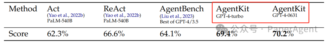 在WebShop任务中,AgentKit设计了一个零样本智能体,不依赖于人类轨迹的示例,而是通过定制节点来完成任务。 智能体在WebShop上与基线系统的对比。为了节省成本,报告了WebShop前100个样本的得分。AgentKit在使用GPT-4和成本更低的GPT-4-turbo时都达到了最先进的性能。
