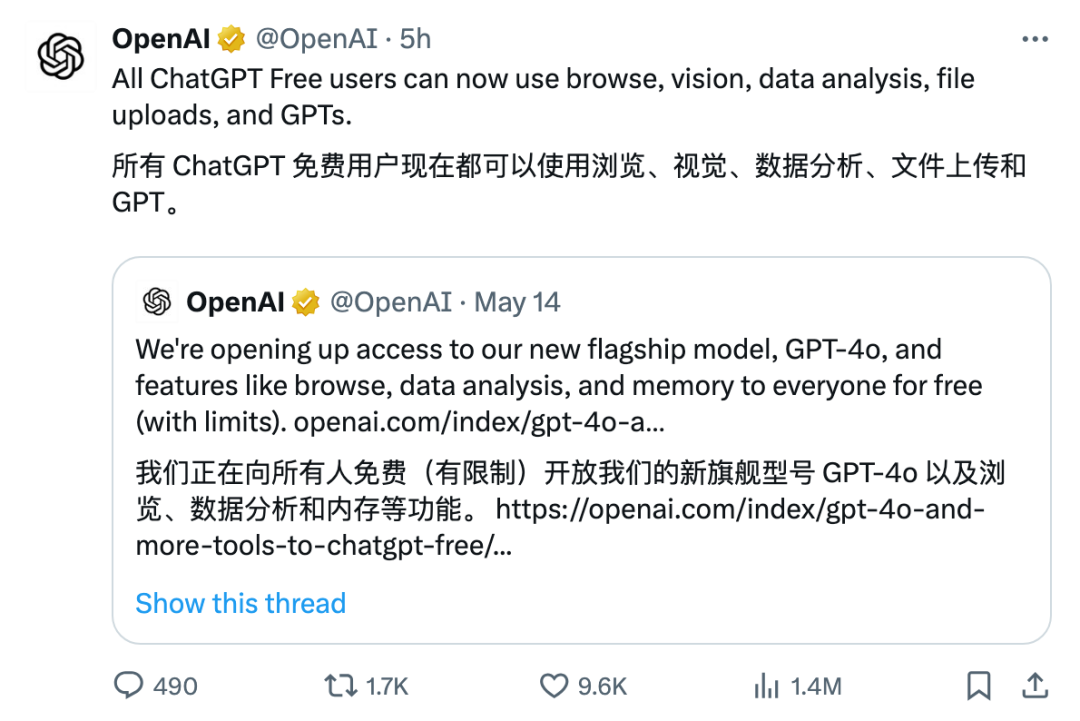 今天OpenAI给所有用户全量免费后,我觉得这Plus会员肯定是还需要续的。因为这4o的免费完全不是为了剥削plus会员的福祉,而是给免费用户的诱食记,勾引他们付费呢。