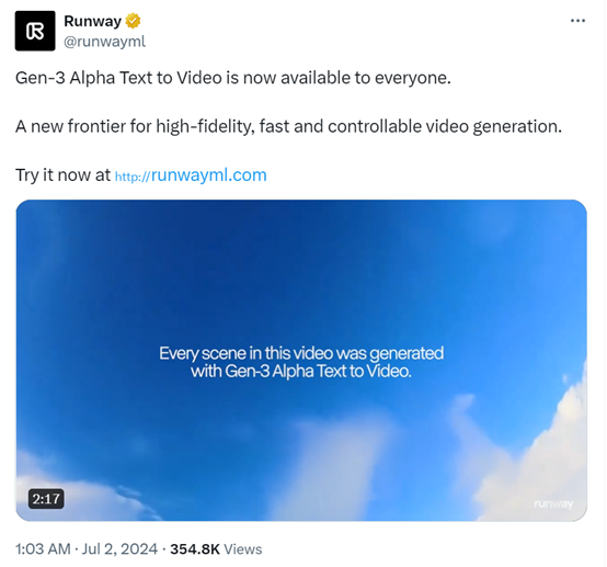 7月2日凌晨,著名生成式AI平台Runway在官网宣布,其文生视频模型Gen-3 Alpha向所有用户开放使用。