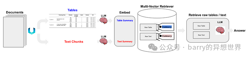 通过测试发现,第三种方法总体效果最好。然而,根据我的测试,第三种方法在检测表格方面存在困难,更不用说正确合并表格标题了。 Langchain 也提出了一些解决方案,Semi-structured RAG的关键技术包括: 如图 5 所示: