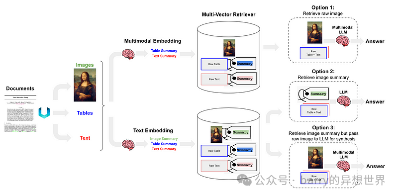 Semi-structured and Multi-modal RAG提出了三种解决方案,架构如图 6 所示。