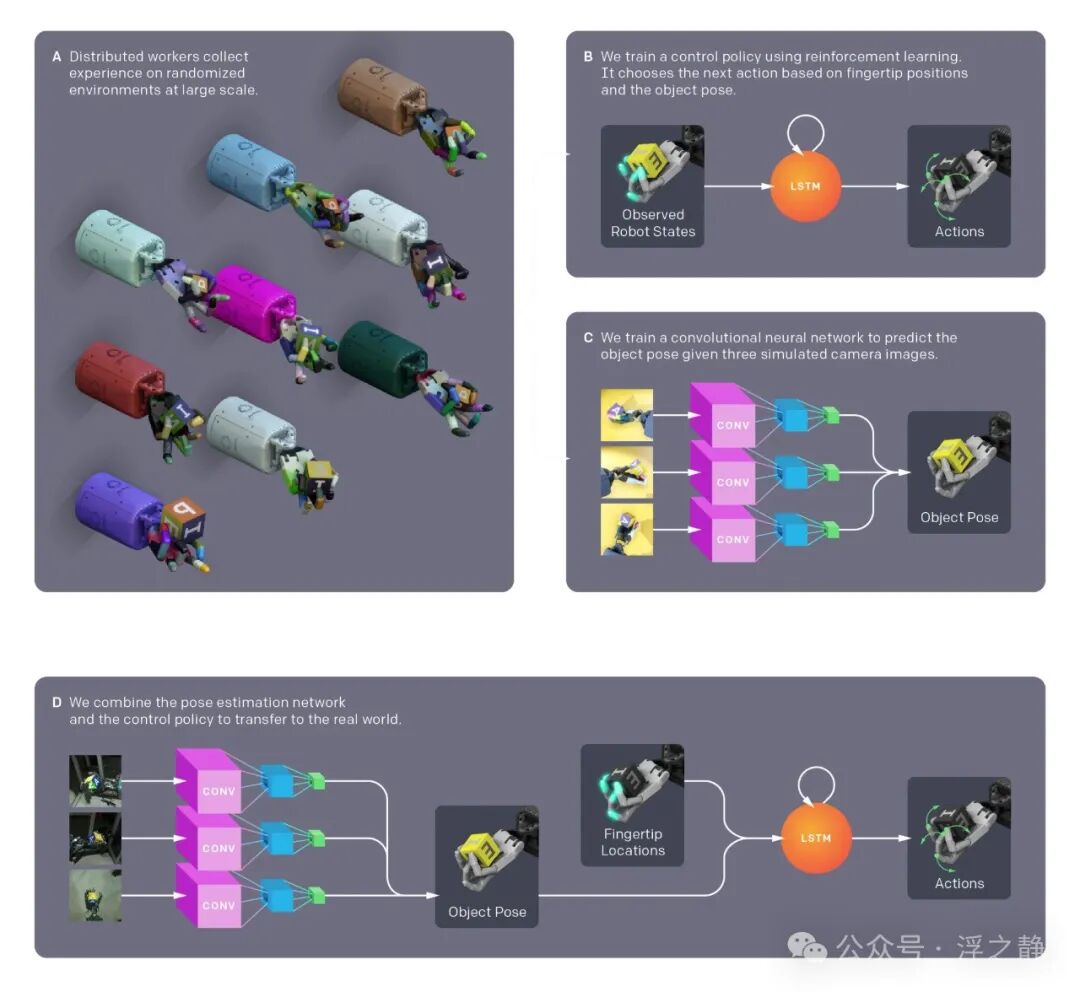 2019 年,OpenAI 展示了 Dactyl 能够解开魔方的能力。机器人能在 60% 的情况下成功解开魔方。像魔方这样的物体引入了复杂的物理问题,这些问题难以建模。OpenAI 通过使用自动领域随机化(ADR)增强了 Dactyl 应对干扰的鲁棒性,ADR 是一种生成逐渐更难环境的仿真方法。ADR 不同于手动领域随机化,因为它不需要人为指定随机化范围。