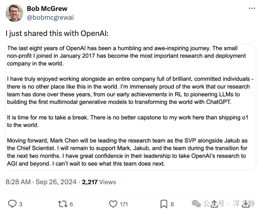我刚刚与 OpenAI 分享了这个: 过去的八年在 OpenAI 的经历让我感到谦卑和敬畏。我在 2017 年 1 月加入的那个小型非营利组织,如今已成为全球最重要的研究与部署公司。 我非常享受与一群才华横溢、全心投入的同事们一起工作——全世界没有任何地方能与之相比。我为我们研究团队这些年来的工作感到无比自豪,从早期在强化学习(RL)方面的成就,到开创大型语言模型(LLM),再到构建首个多模态生成模型,最终通过 ChatGPT 改变了世界。 现在是时候让我休息一下了。没有比推出 o1 给世界更好的方式来结束我在这里的工作了。 展望未来,Mark Chen 将担任高级副总裁,领导研究团队,Jakub 将继续担任首席科学家。我将在未来两个月内继续支持 Mark、Jakub 和团队完成过渡。我对他们的领导充满信心,他们将引领 OpenAI 的研究迈向 AGI 及更远的未来。我迫不及待想看到这个团队接下来会做些什么。 注:Bob McGrew 曾任职 OpenAI 首席研究官 (Chief Research Officer)