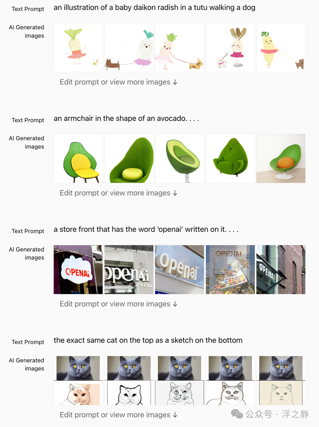 文本到图像(Text-to-image)DALL-EDALL-E[26] 是一种变压器模型,能够根据文本描述生成图像,于 2021 年发布。DALL-E 使用一个拥有 120 亿参数的 GPT-3 版本来解释自然语言输入并生成相应的图像。它既可以生成现实中的物体图像,也可以生成不存在于现实中的物体。截至 2021 年 3 月,尚未提供 API 或代码。