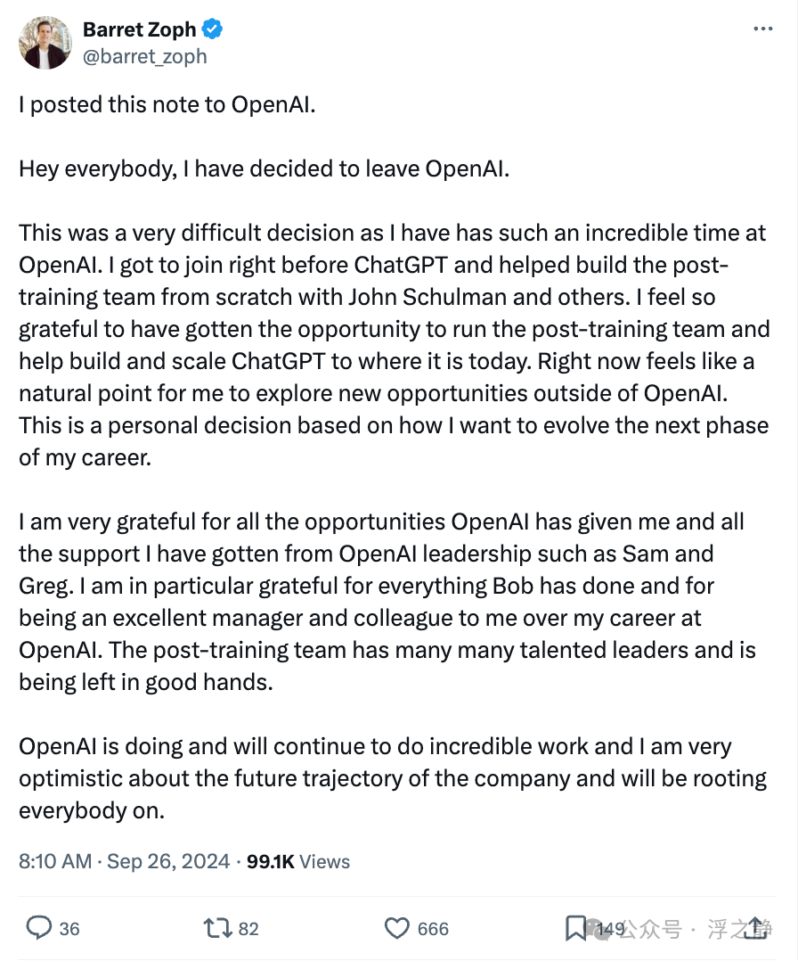 我在 OpenAI 发布了这条通知。 大家好,我决定离开 OpenAI。 做出这个决定非常困难,因为我在 OpenAI 的时光是如此美好。在 ChatGPT 推出之前我加入了团队,并与 John Schulman 及其他人一起从零开始建立了后训练团队。我非常感激能够有机会领导后训练团队,并帮助 ChatGPT 发展壮大至今天的规模。现在我觉得是时候在 OpenAI 之外探索新的机会了。这是基于我个人职业生涯下一阶段发展的选择。 我非常感激 OpenAI 为我提供的所有机会,以及从 OpenAI 领导层(如 Sam 和 Greg)那里得到的所有支持。尤其感谢 Bob 在我 OpenAI 职业生涯中给予的一切,他一直是出色的经理和同事。后训练团队中有许多优秀的领导者,我相信他们能够很好地接手工作。 OpenAI 正在做出并将继续做出令人难以置信的工作,我对公司的未来充满乐观,并会一直为大家加油。 注:Barret Zoph 曾任职 OpenAI 研究副总裁 (VP Research (Post-Training))