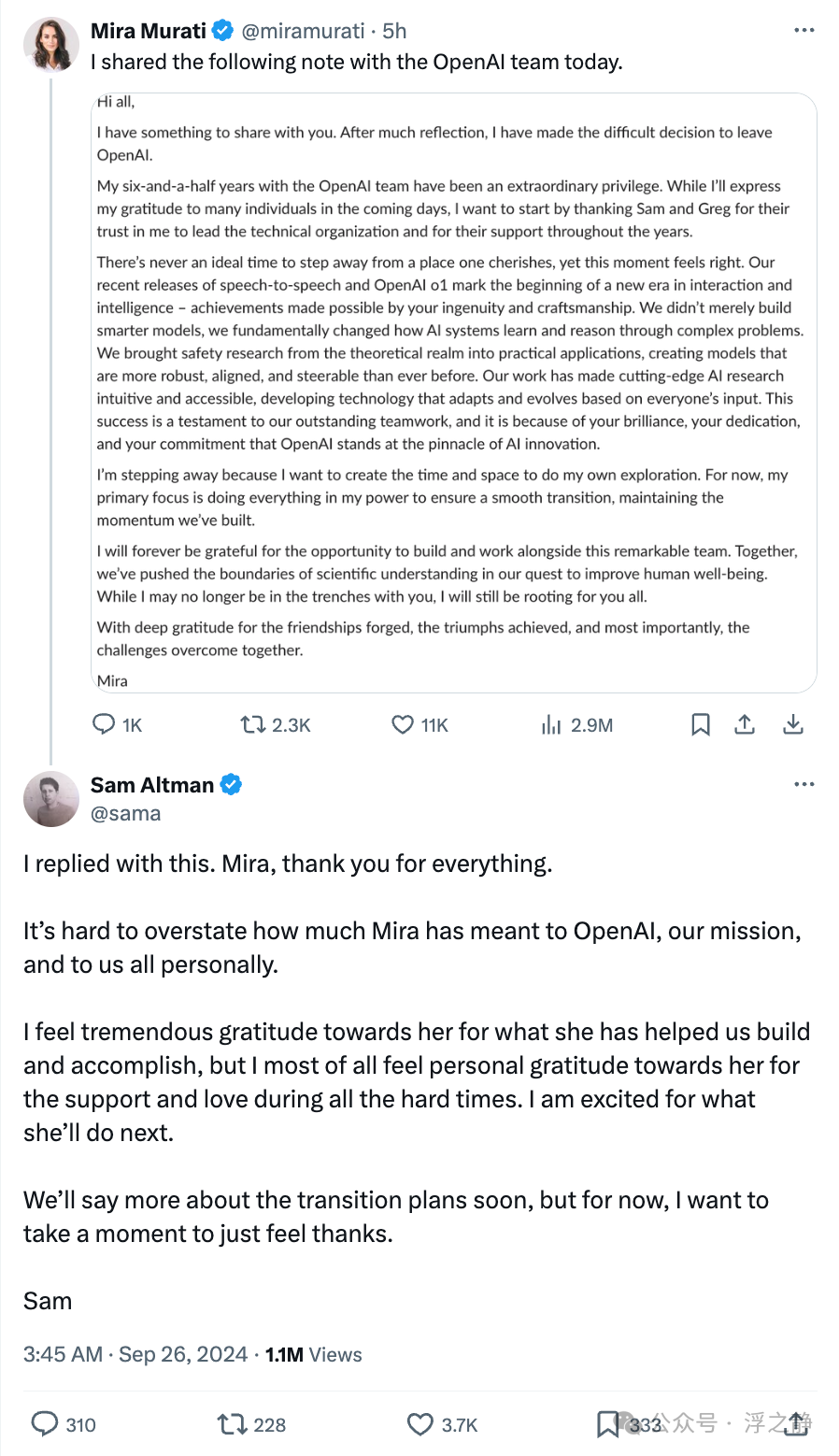 我今天与 OpenAI 团队分享了以下说明。 大家好, 我有一件事想要和大家分享。经过深思熟虑,我做出了离开 OpenAI 的艰难决定。 与 OpenAI 团队共度的六年半时光对我来说是非凡的荣耀。在接下来的日子里,我会对许多人表达我的感激之情,但我想先感谢 Sam 和 Greg,感谢他们信任我领导技术团队,并在这些年里给予了我支持。 永远没有一个理想的时刻去离开一个自己珍视的地方,但此刻感觉是对的。我们最近发布的语音到语音和 OpenAI o1 标志着交互和智能领域新时代的开始——这些成就得益于你们的创造力和精湛技艺。我们不仅仅是构建了更智能的模型,我们从根本上改变了 AI 系统如何通过复杂问题进行学习和推理。我们将安全研究从理论领域带入实际应用,创建了比以往更具鲁棒性(robust)、对齐性(aligned)和可控性(steerable)的模型。我们的工作使前沿的 AI 研究变得直观和易于访问,开发出能够根据每个人的输入进行适应和进化的技术。这些成功是我们杰出团队合作的证明,正是因为你们的才华、奉献和承诺,OpenAI 才能站在 AI 创新的顶峰。 我选择离开是因为我想为自己创造时间和空间去探索。现在,我的首要任务是尽我所能确保平稳过渡,保持我们已经建立的势头。 我将永远感激能够与这样一个非凡的团队一起建设和工作的机会。我们共同推动了科学认知的边界,致力于改善人类福祉。虽然我可能不再与你们并肩作战,但我依然会为你们加油。 怀着对友谊、成就,尤其是我们共同克服的挑战的深深感激之情, Mira (注:Mira 曾任职 OpenAI CTO)