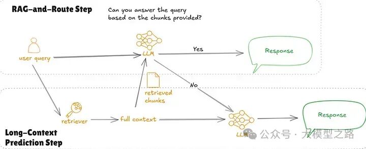 鉴于RAG和长上下文LLM之间的权衡,科学家们提出了一种名为“SELF-ROUTE”的混合技术。SELF-ROUTE是一个两步过程: RAG-and-Route步骤:系统使用 RAG 来检索与查询相关的信息,并提示大型语言模型(LLM)来判断查询是否可以回答,并在可能的情况下生成答案。如果模型认为可以回答,那么就使用 RAG 的结果作为最终答案。如果模型认为无法回答,那么系统将进入第二步。 长上下文预测步骤:将整个上下文提供给模型,模型基于此扩展输入生成最终响应。