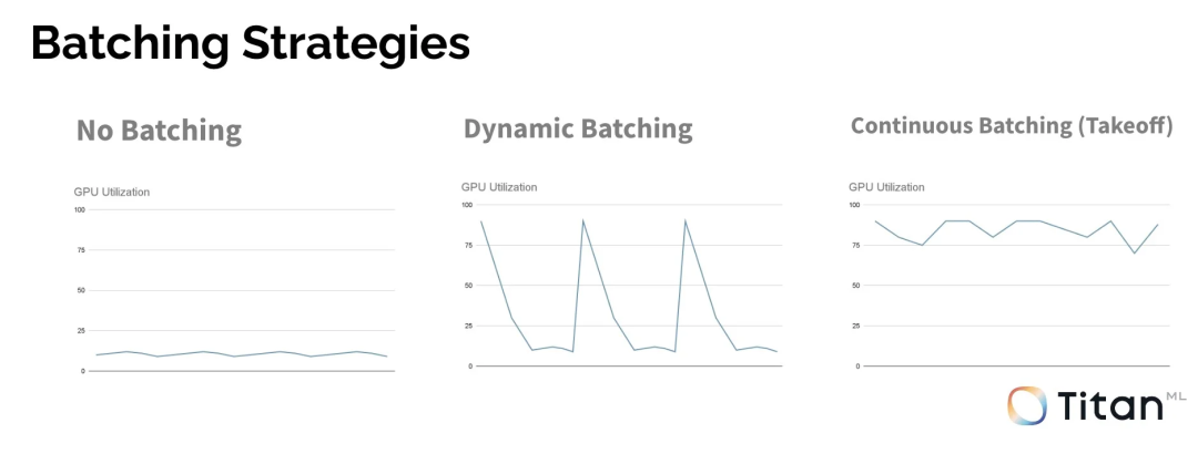 对于生成式模型来说,最有效的方法是采用持续批处理,它允许新到的请求打断正在进行中的请求,以维持高 GPU 利用率。这正是我们在推理栈(Titan Takeoff)中所采用的策略。通过采用不同的批处理策略,无需对模型本身做出任何改变,就能实现 GPU 利用率大约 5 倍的提升,并带来了更好的用户体验。