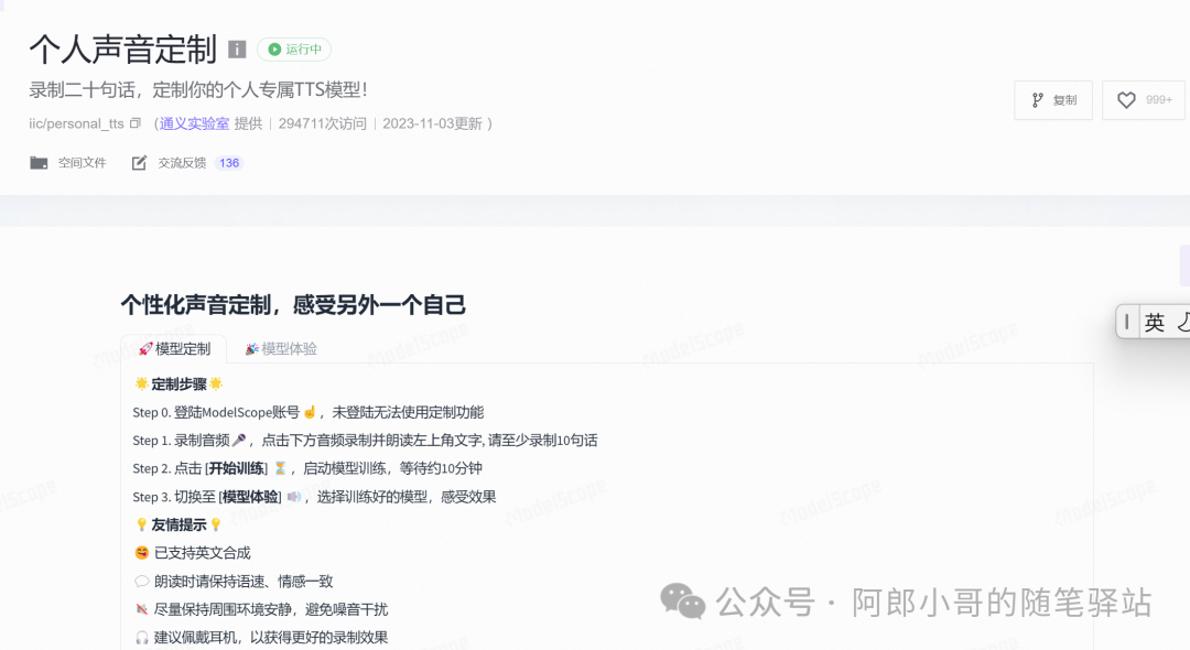 其架构图如下: 对于SamBERT更详细的技术介绍,可参考:文档[1]。本篇主要讲解模型实际的试用,对于技术原理给出的魔塔文档链接已经比较详细的介绍了。 ModelScope试用在魔塔社区[2]上,提供了SamBERT的创空间和模型库: 这些创空间与模型库的文档非常详细,按照文档直接试用即可,每个魔塔新用户都有免费GPU服务器试用名额,可以玩转一下这些模型。 我选择的场景是个人声音定制,选择创空间,然后录制声音,开始训练: 开始体验: 合成后,播放录音,效果不错,还是可以的。当然对于长上下文、方言等场景支持有一定的限制。 私有化搭建模型库:SambertHifigan个性化语音合成-中文-预训练-24k[3] 支持私有化部署,对于一些简单业务场景或是个人试玩,可以在服务器上搭建。该模型库介绍很详细,直接按流程就可以部署与微调。 写在结尾对于一些业务场景,如果要求不是很高,不是很复杂;我个人是强烈建议在ModelScope上找找开源模型,然后私有化部署。之前我个人还遇到一些场景也是在ModelScope找模型部署搭建使用。现在机器学习/深度学习/神经网络等人工智能算法应用将会越来越普及,我们也可以考虑将其纳入业务场景应用中,而不是只考虑业务场景的CRUD;闲余时间还可以阅读分析下原理。 |
