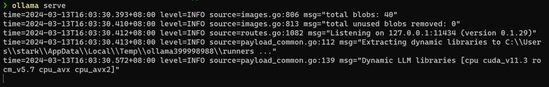 在ollama官网安装相应版本的ollama,并在后台开启服务。在浏览器输入http://localhost:11434/,提示Ollama is running,表示后台服务开启。也可以手动开启ollama服务。在命令行输入ollama serve,这个命令窗口不要关闭,后台一些信息都会在这里显示。