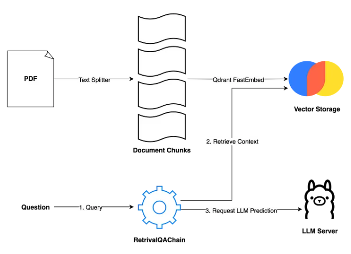 首先,它将文档拆分为更小的块以适应 LLM 的标记限制;其次,它使用Embeddings 对这些块进行矢量化并存储到 Chroma 中。该方法处理用户查询。用户可以提出一个问题,然后 Retrieval使用向量相似性搜索技术检索相关上下文(文档块)。通过用户的问题和检索到的上下文,我们可以编写一个提示,并请求 LLM 服务器进行预测。