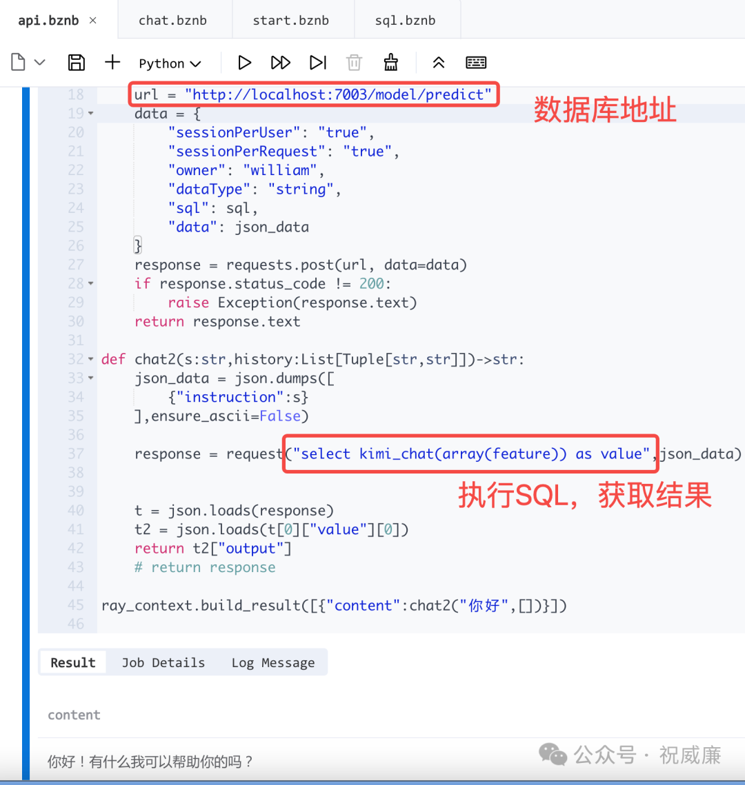 拿到数据后,我可以通过一条SQL语句就让大模型对数据做处理,处理完后再用一条语句就可以写回到业务数据库。
