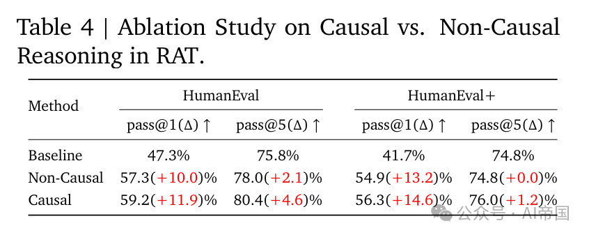 消融研究中还探讨了RAT中因果推理的影响。在这项研究中,论文有系统地检查了因果和非因果推理方法对RAT系统性能的影响,以思维链(CoT)作为基线。如表4所总结的结果显示,在生成能力方面,采用因果推理技术取得了显著的提升。