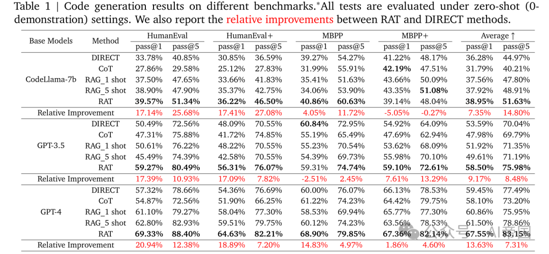 代码生成包括HumanEval、HumanEval+、MBPP和MBPP+。这些基准测试涵盖了广泛的编程问题,从简单的函数实现到更复杂的算法挑战,为评估生成能力提供了一个强有力的测试平台。 数学推理评估是在GSM8K和GSM-HARD数据集上进行的,该数据集包含数千个多步数学问题。 创意写作任务用于评估RAT的多功能性,包括调查、总结等,突出了开放式文本生成的不同方面。 规划任务在开放式环境Minecraft中进行评估。通过MCTextWorld评估了一组从简单目标到具有挑战性的钻石目标的100个任务。 评估指标。对于代码生成,论文选择了经典的通过率pass@k作为评估指标,k表示采样数量。论文计算准确度来评估数学推理任务中的每个问题,与GSM8K的既定指标保持一致。对于体现规划任务,论文计算MC-TextWorld中的计划执行成功率作为可执行性。论文还进行了人工等级评估,计算了体现规划(作为可信度)和创意写作任务的真实技能评级分数。这些指标值越高越好。 基线模型。为建立全面和公平的比较环境,论文纳入了一系列基线方法。论文的基线包括原始语言模型,称为DIRECT,以及由Lewis等人(2020b)记录的单次(1shot)和多次(5shot)配置下的检索增强生成(RAG)方法,带有n个检索示例。此外,论文检查了由Kojima等人(2022)概念化的zero-shot CoT(CoT)方法,它模拟逐步推理过程来促进零示例下的复杂问题解决任务。对于不同的方法,使用了相同的语言模型作为基础模型。为确保公平比较,所有方法在上下文学习时都未使用基准测试中的示例。 RAG设置。RAT利用了检索增强生成方法的能力,通过整合外部知识源来提高语言模型的性能。具体来说,论文使用codeparrot/github-jupyter数据集作为代码生成和数学推理任务的主要搜索向量库。对于Minecraft中的体现规划任务,论文使用Minecraft Wiki1和DigMinecraft2网站作为大型语言模型可访问的信息源。对于开放式创意写作任务,论文使用Google在互联网上搜索查询。论文使用OpenAI的text-embedding-ada-002 API服务计算不同方法和基础模型的所有嵌入。 考虑到基准污染的风险(代码库可能包含正在评估的确切问题的解决方案),论文采用了Guo等人(2024年)所述的严格预处理方法。基准污染的潜在影响以及论文的预处理策略的有效性在附录D中有详细讨论。 2.3.2 结果