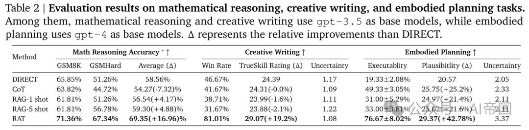 RAT在代码生成、数学推理、创意写作和体现规划等多种任务中经过了严格验证。这些不同类型的任务凸显了RAT的泛化能力,展现了其在高度多样的挑战中的稳健性能。对于数学推理任务,RAT展现出显著的相对改进,当应用于GPT-3.5模型时,总体平均改进达到18.44%。这种改进趋势在GPT-4上也有体现,从DIRECT到RAT相对改进了10.26%,成绩显著。这些发现凸显了RAT的稳健性,以及其有效增强语言模型在广泛的计算和创意任务中的性能。