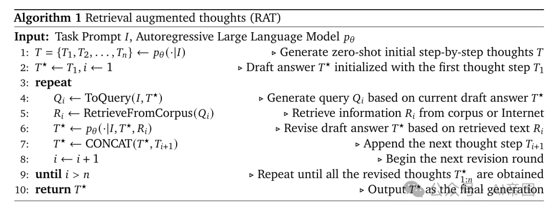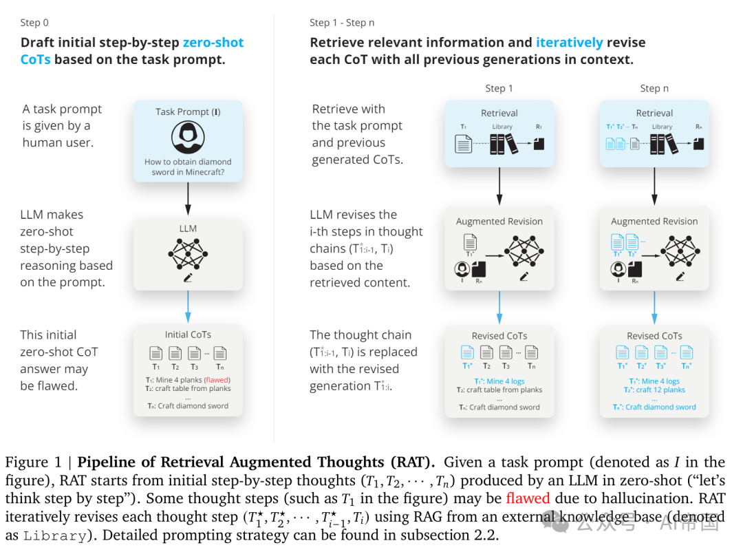 LLM在各种自然语言推理任务上取得了丰硕的进展,尤其是在结合大模型和精心设计的提示策略时。然而,人们越来越关注LLM推理的事实正确性,引用模型响应或中间推理路径可能出现的幻觉。当涉及zero-shot CoT提示(即"让论文一步步思考")和需要多步且需要背景感知推理的长期生成任务时,这个问题变得更加严重,包括代码生成、任务规划、数学推理等。事实有效的中间思路对于成功完成这些任务至关重要。 已提出了几种提示技术来缓解这一问题,其中一个有前景的方向是检索增强生成(RAG),它从人类推理中获取见解,并利用检索到的信息来促进更加基于事实的推理。在本文中,论文探讨如何将RAG与精心设计的长期推理相结合。论文的直觉是,在中间推理过程中的幻觉可以通过外部知识的帮助得到缓解。由此产生的提示策略称为检索增强思维(RAT),如图1所示。论文的策略包括两个关键想法。 首先,LLM产生的初始zero-shotCoT以及原始任务提示将被用作查询,以检索可能有助于修订可能存在缺陷的CoT的信息。其次,论文设计了一种逐步方法,而不是一次性检索和修订整个CoT并生成最终响应。LLM按照CoT(一系列子任务)一步步生成响应,仅根据使用任务提示、当前和过去的CoT检索到的信息来修订当前思维步骤。这种策略可以类比于人类推理过程:在解决复杂的长期问题时,论文利用外部知识来调整逐步思考。RAT与其他方法的比较可以在图2中找到。