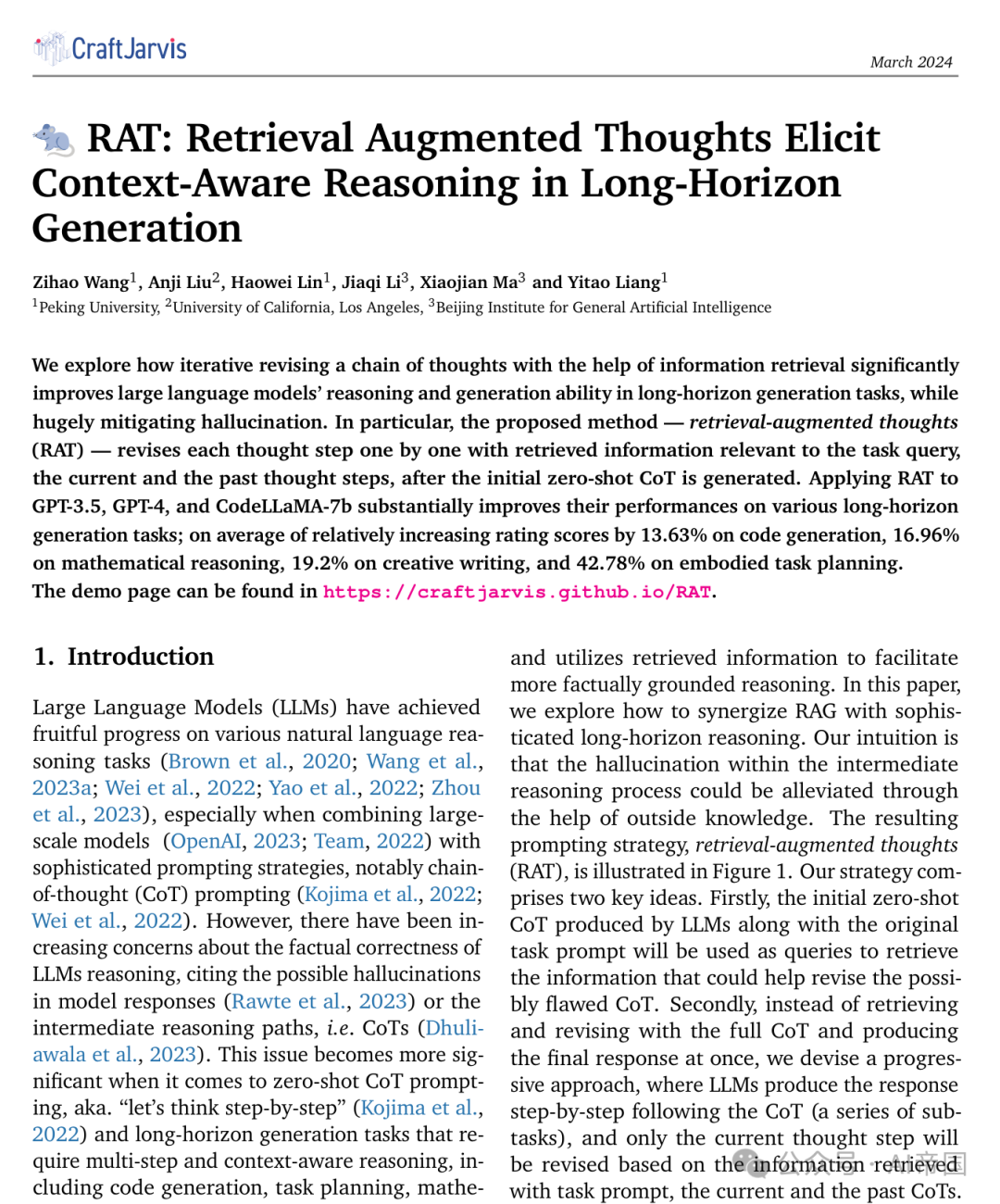 论文探索了如何利用信息检索来迭代修订思维链,从而显著提高大型语言模型在长期生成任务中的推理和生成能力,同时极大地缓解了幻觉产生的问题。论文提出了检索增强思维(RAT),这是一种简单而有效的提示策略,它通过协同思维链(CoT)提示和检索增强生成(RAG)来解决具有挑战性的长视距推理和生成任务。论文的关键思想是通过使用思维作为查询来通过RAG修订LLM生成的zero-shot思维链,并逐步因果修订思维并生成响应。RAT,一种zero-shot提示方法,在具有挑战性的代码生成、数学推理、体验任务规划和创造性写作任务上表现出明显优势,优于普通的CoT提示、RAG和其他基线。
