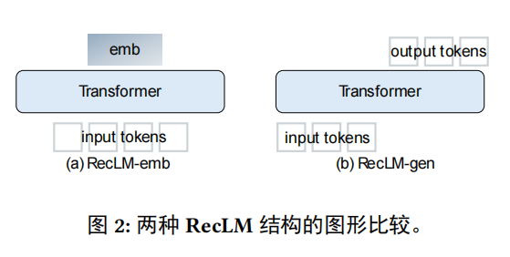 为此,作者提出了专门针对推荐任务进行语言模型微调。引入了基于嵌入RecLM-emb和基于生成RecLM-gen两种模型,如图所示。