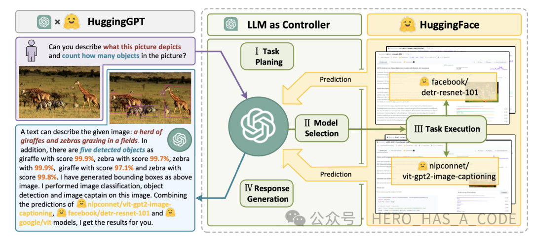 HuggingGPT融合了HuggingFace中成百上千的模型和GPT,可以解决24种任务,包括文本分类、对象检测、语义分割、图像生成、问答、文本语音转换和文本视频转换。具体步骤分为四步:
