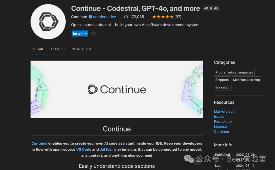 Continue是一个由硅谷YC支持的AI代码编程助手,提供VSCode和JetBrains插件,类似Github Copilot。Continue是开源的,而且支持Ollama,这意味着我们可以定制自己的AI编程助手。 GitHub:https://github.com/continuedev/continue VSCode插件:https://marketplace.visualstudio.com/items?itemName=Continue.continue JetBrains插件:https://plugins.jetbrains.com/plugin/22707-continue 也可以IDE的插件市场搜索 continue