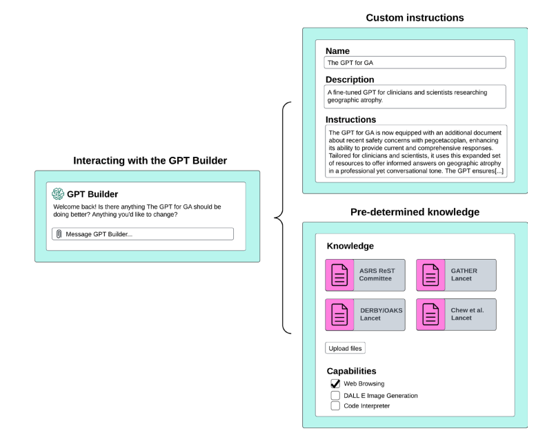 图1展示了通用GPT与自定义GPT架构的简化对比。通用GPT的操作是线性的:用户提示由LLM处理以生成响应。而自定义GPT将自定义指令和特定领域的知识整合到过程中。在这里,用户提示与开发人员提供的自定义指令结合,引导LLM,LLM还可以检索外部知识(例如,网络搜索、临床指南和数据库)以产生一致的响应。GPT,生成型预训练变换器;LLM,大型语言模型。 自定义GPT调整自定义GPT涉及使用自然语言的自定义指令和通过RAG的内容检索。我们在图1中概述了自定义GPT的工作原理。‘GPT Builder’是自定义GPT的后端,允许用户使用自然语言调整模型,如图2所示。目前,可以为RAG提供多达10份文档,每份文档的令牌限制为200万个。33 令牌是LLM用于处理文本的分析单位。一个令牌大致相当于四个字符,相当于0.75个单词。34 每份文档200万个令牌相当于大约150万个单词,这对于大多数临床文档、指南和教科书来说都是足够的。 自定义指令可以使模型更加可调,以适应特定的用户意图。在医疗保健中,您可能希望模型保持事实正确性、专业语气、隐私和保密性、限制认识和风险沟通等。关于内容检索,LLM倾向于虚构信息,这通常被称为“幻觉”。35 36 这对于临床使用是一个问题,并将限制LLM的部署。RAG可以通过将模型建立在补充LLM内部眼科表示的外部知识来源上来改善LLM的输出并减少幻觉。37 对于我们的自定义GPT,我们与循证医学的价值观保持一致,提供同行评审文献和临床指南作为特定领域的知识。38 临床指南尤其有价值,因为它们代表了一个特定组织专家小组的共识。39 40 通过将自定义GPT定制到临床指南,我们可以提供适应当地医疗保健环境的特定领域知识。 用例 教育:生成问题的主动学习“EyeTeacher”展示了用户如何通过自定义GPT生成的答案来增强对临床指南的理解。作为一种主动学习工具,这种学习方法可以促进更有效的知识获取和保持。41 作为示例,我们提供了来自皇家眼科学院的两份关于糖尿病视网膜病变(DR)和闭角型青光眼(ACG)管理的临床指南。42 43 我们选择这些主题,因为它们是普通眼科医生常见的情况。这两个指南都在自定义GPT的令牌限制内(DR:147页,大约66000个令牌。ACG:44页,大约19000个令牌)。我们在图3中展示了一个示例。 我们指示自定义GPT成为一个互动、主动学习工具,生成单选问题,有最佳答案。问题将从上传的文档中生成。我们还指示GPT询问用户的经验水平,并根据用户的经验水平调整问题的难度。为了保持医学题库的格式,我们指示GPT为答案提供解释。对于内容检索,GPT被指示从提供的文档中创建问题。与EyeTeacher互动的能力类似于与个人导师对话。它为用户提供了灵活性,使他们能够引导自己的学习。他们可以要求更简单或更难的问题。他们可以选择主题,并在需要时请求澄清主题。我们提供的示例来自一份临床指南;然而,您也可以通过上传笔记并询问特定主题的问题来使用这种方法准备考试。