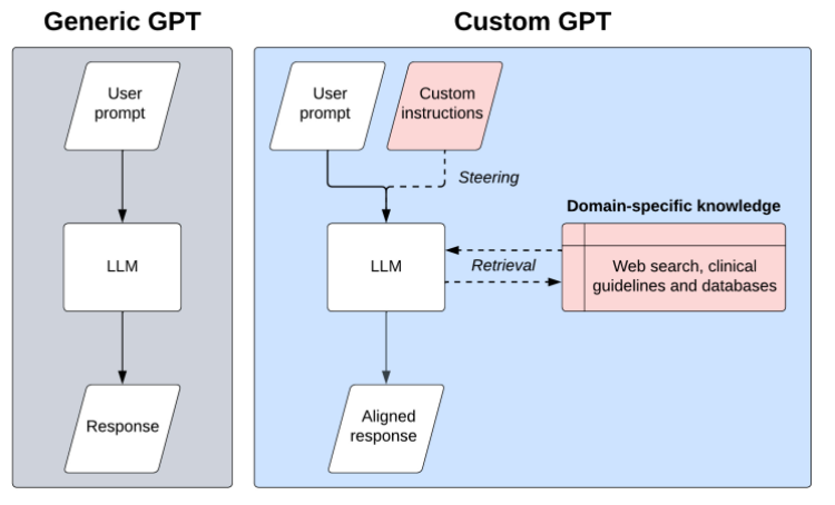摘要基础模型是下一代人工智能,具有为医疗保健提供新颖用例的潜力。大型语言模型(LLMs),一种基础模型,能够进行语言理解和生成类似人类的文本。研究人员和开发人员一直在调整LLMs以优化它们在特定任务中的表现,如医学挑战问题。直到最近,调整还需要技术编程专业知识,但OpenAI发布的自定义生成预训练变换器(GPTs)允许用户使用自然语言调整自己的GPTs。这有望在全球范围内普及高质量定制LLMs的访问。在本次综述中,我们提供了LLMs的概述,它们是如何调整的,以及自定义GPTs是如何工作的。我们提供了三个在眼科学中自定义GPTs的用例,以展示这些工具的多功能性和有效性。首先,我们介绍了“EyeTeacher”,它从临床指南生成问题以促进学习。其次,我们构建了'EyeAssistant',这是一个临床支持工具,它通过临床指南进行调整以响应各种医生查询。最后,我们设计了'GA的GPT',它通过分析同行评审的文档,为临床医生提供地理萎缩新兴管理策略的全面总结。综述强调了在眼科学中为特定任务调整GPTs时自定义指令和信息检索的重要性。我们还讨论了LLM响应的评估,并解决了它们在临床应用中的关键方面,如隐私和问责。最后,我们讨论了它们在眼科教育和临床实践中的潜力。 引言基础模型是构建人工智能(AI)系统的新范式。由于计算能力的提高、transformer模型架构的发展和大数据集的可用性,它们已经获得了相当大的吸引力。1自然语言处理(NLP)领域已经看到了显著的实际应用,随着大型语言模型(LLMs)的出现。2LLMs是基础模型,它们在大规模的文本语料库上进行训练,这使得它们具有语言理解和生成类似人类文本的能力。1 3 一个著名的例子是生成型预训练变换器(GPTs)。3人们对评估LLMs在医疗保健中的作用越来越感兴趣。4尽管LLMs没有专门训练医学知识,但它们在包括医学挑战问题在内的许多领域展示了泛化能力。5随着LLMs的更新,它们在回答医学考试问题方面的表现正在提高,包括眼科学领域。4 6–11 然而,由于这些通用模型可能没有在经过审查的医学信息上进行训练,因此在患者护理中的部署将是一个挑战。12 为了解决这个问题,可以使用特定领域的信息来调整通用LLMs。例如,BiomedBERT和BioGPT等模型已经训练了同行评审文献的内容,而Med-PaLM则训练了临床问题数据库。4 13 14 模型也可以进行特定于任务的调整,例如指令调整,Med-PaLM 2就是这样。这些方法在生物医学NLP任务中显示出了相当大的增益,包括回答医学考试问题。7 15 提示策略(查询模型的不同方式)也可以用来增强模型。这方面的一个例子是Medprompt。它使用创新的提示策略与GPT-4一起,超越了使用特定领域和特定任务调整的Med-PaLM 2,在回答医学考试问题方面。5 尽管这些解决方案很有价值,但仍然存在一个问题,即由于训练和调整是使用截至某个时间点的数据快照来进行的,因此无法捕捉到最新的信息。16 由于数据的广泛性和训练过程的耗时性,更新LLMs知识库存在固有的延迟。这在医学领域尤其重要,因为最新的知识和基于证据的实践是高质量医疗保健的基础。最近,一些LLMs被增强为具有实时互联网浏览能力,允许它们搜索互联网以获取最新的内容来制定回应。17 18 最新的医学信息是基于证据的医学的一个重要特征,19 因此在临床环境中使用的LLMs中具有实时信息是一个关键特征。 在2023年11月,OpenAI引入了一项功能,允许用户使用自然语言自定义自己的GPT。20 在此交互过程中,GPT开发人员可以提供自定义指令给GPT,以确定其功能、与用户的互动、回答问题的方式、语气以及它如何检索信息。可以指示GPT使用外部工具,如互联网搜索和/或开发者上传的文档。实际上,这利用了自定义GPT的自然语言能力和从预定来源检索信息的能力。这种程度的定制可以帮助克服LLM提供错误信息的问题,并在更多地依赖使用可信的预定来源时减少不准确性的问题。21 在本综述中,我们提供了三个在眼科学领域中自定义GPT的用例以及临床医生如何与这些工具互动。首先,“EyeTeacher”是一个教学工具,它从选定的临床指南中创建问题。其次,“EyeAssistant”是一个临床助手,它回答临床查询,调整到临床指南。第三,“GA的GPT”可以通过检索上传到GPT的同行评审文档中的信息,为临床医生提供地理萎缩(GA)当前管理的概述。通过这些示例,我们展示了如何通过仔细的自定义指令和信息检索来调整ChatGPT以完成特定任务。我们还回顾了如何评估LLM,并探讨了在临床实践中使用这些工具的隐私和问责问题。 自定义LLMsLLMs在大型文本语料库上进行训练,积累了超过一万亿个单词。3 22 许多模型已经出现,并通过各自界面提供,如Gemini(由Google开发)、GPT-4(由OpenAI开发)、Claude 2(由Anthropic开发)和LLaMA(由Meta AI开源)。23 这些模型可以用特定领域的信息进行微调,但这需要技术编程专业知识。一个微调模型的例子是Neuro-GPTx,这是一个内容丰富的聊天机器人,用于管理听神经瘤,训练了超过4000篇同行评审文章。24 另一个例子是Almanac,这是一个基于药物的模型,它从教科书和预选的网页文档以及浏览预定网页域中获取特定领域的知识。21 模型架构中还嵌入了一个计算器,可以克服模型无法计数的限制。这些功能可以改进回答临床情景问题的准确性和可靠性。21 自定义LLMs包括各种方法,包括数据驱动策略和关注交互级别增强的方法。25 这些方法可以有效地组合使