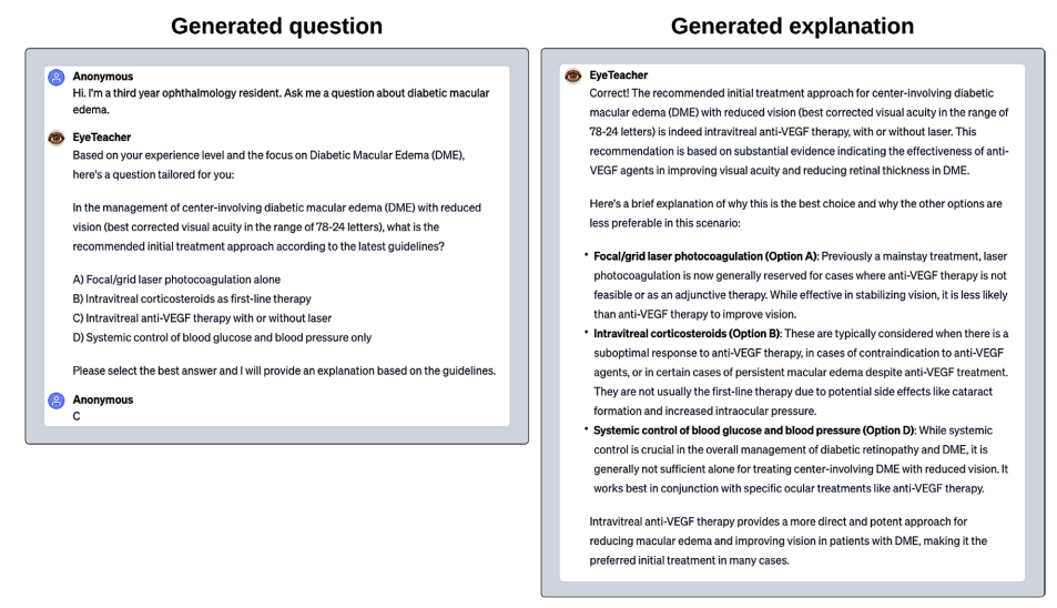 图3 EyeTeacher是一个为教育目的构建的自定义GPT。在这个增强的学习场景中,EyeTeacher提出了关于糖尿病黄斑水肿的单选题。当学生选择一个答案时,EyeTeacher会详细说明为什么这个答案是正确的,并解释为什么每个干扰项是错误的。这种方法至关重要,因为它不仅仅是验证学生的选择,而是教育他们每个选项的细微差别。这种方法促进了主动学习,因为学生不仅记住正确答案,而且理解每个选项背后的逻辑。这些解释没有幻觉,事实上是正确的。GPT,生成型预训练变换器。