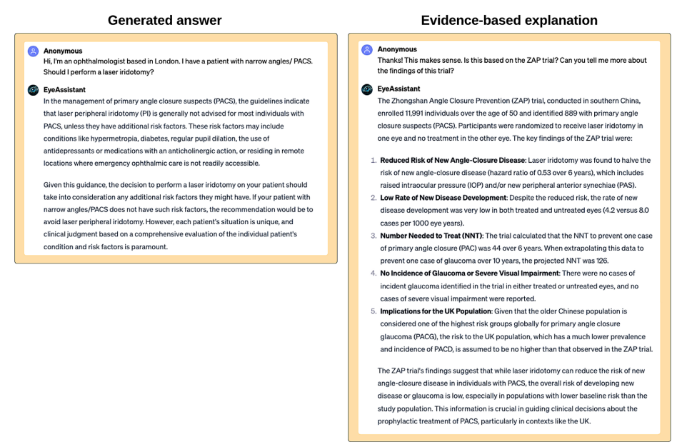 临床助手:与临床指南互动“EyeAssistant”与“EyeTeacher”使用了相同的临床指南,但具有不同的自定义指令,导致不同的用例和使用体验。这个用例的目的是作为一个临床助手。用户可以与助手进行对话,助手拥有来自临床指南的特定领域知识。医生通常通过阅读指南来查询信息;然而,“EyeAssistant”提供了一种互动体验。用户可以要求查看指南的特定部分,并提供临床信息,如检查结果或人口统计信息。EyeAssistant将浏览和检索相关内容。为了提高可靠性,我们可以向GPT添加自定义指令,如果提供的信息不足以生成答案,则要求进一步澄清。我们提供了一个示例,如图4所示。