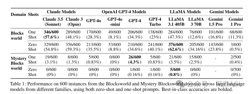 - 在语义相同但句法混淆的数据集-Mystery Blocksworld中,所有LLMs的表现都远远落后,没有一款模型的准确率超过5%。