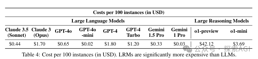 当处理更复杂问题时 o1模型的性能迅速下降。例如,在需要20到40步解决的更大Blocksworld问题上,o1的准确率仅为23.63%。  o1最厉害的一点,是宣称能够准确识别无法解决的问题,这是规划能力的一个重要方面。但是,实验结果显示,在被修改为无法解决的Blocksworld问题上,o1正确识别不可解问题的比例并不高,为27%,并且有时会错误地声称可解问题为不可解。 最后是平衡成本和效率 下表中,大型推理模型(LRMs)比大型语言模型(LLMs)的成本要高得多。 - o1模型的推理成本远高于传统LLMs,这可能会影响其在实际应用中的可行性。