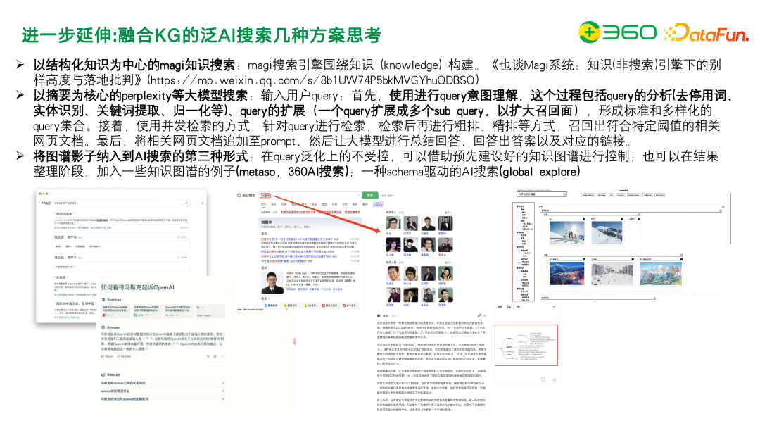 3.进一步延伸:融合 KG 的泛 AI 搜索几种方案思考 最后一个点,和大家分享融合 KG 的泛 AI 搜索的几种方案思考:(https://mp.weixin.qq.com/s/8b1UW74P5bkMVGYhuQDBSQ)以摘要为核心的 perplexity 等大模型搜索:输入用户 query:首先,使用进行 query 意图理解,这个过程包括 query 的分析(去停用词、实体识别、关键词提取、归一化等)、query 的扩展(一个 query 扩展成多个 sub query,以扩大召回面),形成标准和多样化的 query 集合。接着,使用并发检索的方式,针对 query 进行检索,检索后再进行粗排、精排等方式,召回出符合特定阈值的相关网页文档。最后,将相关网页文档追加至 prompt,然后让大模型进行总结回答,回答出答案以及对应的链接。