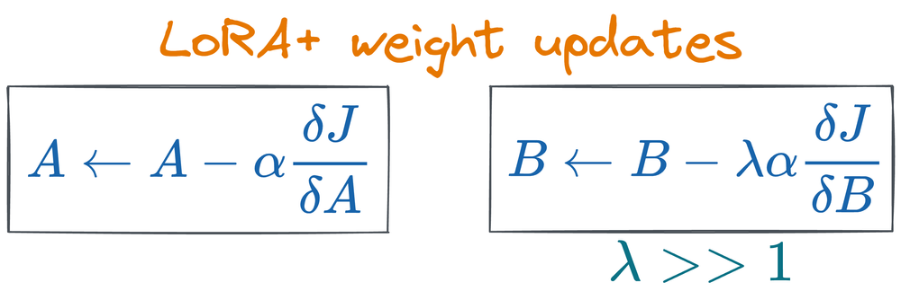 LoRA+ 是通过为低秩矩阵 A 和 B 设置不同的学习率解决这个问题。更具体地说,通过为矩阵 B 设置更高的学习率解决此问题: