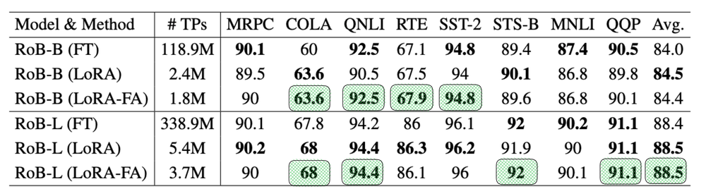 在 LoRA-FA 的论文中,针对不同模型架构(如 RoBERTa、T5 和 LLaMA)进行了实验,涵盖了多个规模和任务。结果表明,LoRA-FA 可以接近全量微调及标准 LoRA 方法所达到的微调精度。