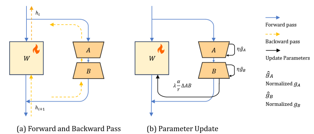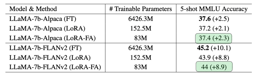 LoRA-FA 通过优化内存使用来解决这一挑战,不牺牲微调性能,也无需使用诸如激活重计算之类的高成本计算。其关键修改在于选择性更新机制,在LoRA-FA中,矩阵 A 在初始化后被冻结,作为随机投影;矩阵 B 在用零初始化之后进行训练(就像在原始LoRA中一样)。这将参数数量减半,但具有与普通LoRA 相当的性能: