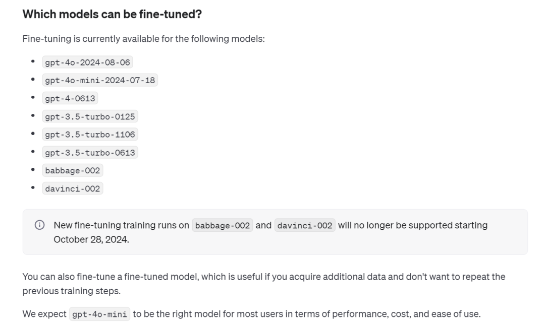 以 OpenAI 为例, 其提供了一个微调 API,用于根据用户的需求定制模型,目前支持的模型包括 gpt-4o-2024-08-06、gpt-4o-mini-2024-07-18、babbage-002、davinci-002 和 gpt-4-0613 等。