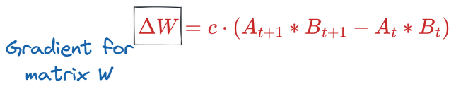 为简化起见,考虑以下步骤 t+1 和 t 所示的低秩矩阵乘积: