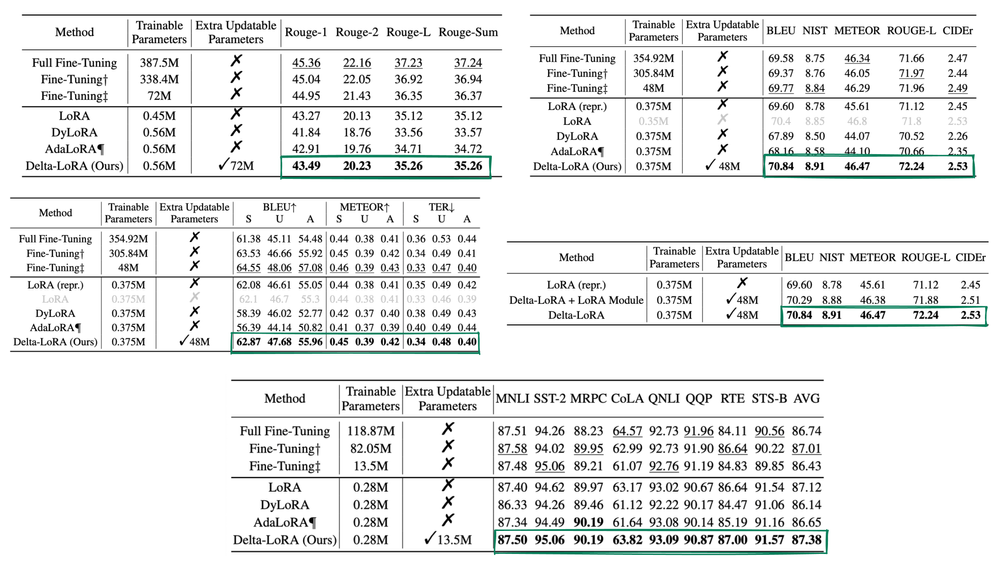 下图汇总了 Delta-LoRA 论文中的一些结果。很明显,与其他所有微调方法相比,Delta-LoRA 始终表现最佳: