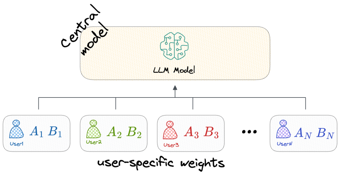 原始的权重矩阵 W 作为所有微调版本的”通用“部分,可以有一个central version(中心版本),即可以在所有用户间共享。