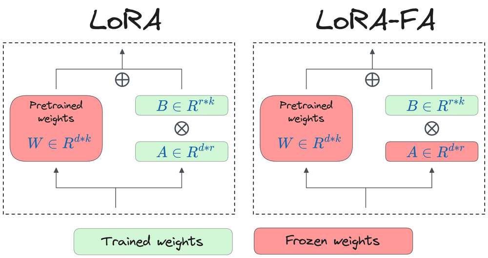 基于 LoRA 技术,LoRA-FA(FA 是 Frozen-A 的缩写)方法引入了一些微小变化,减少了微调时的内存开销。