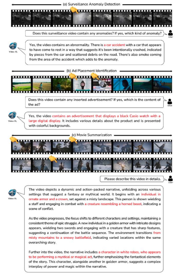 如图三所示,Video-XL 在电影摘要、视频异常检测、广告植入检测等长视频任务上展现了良好的性能。