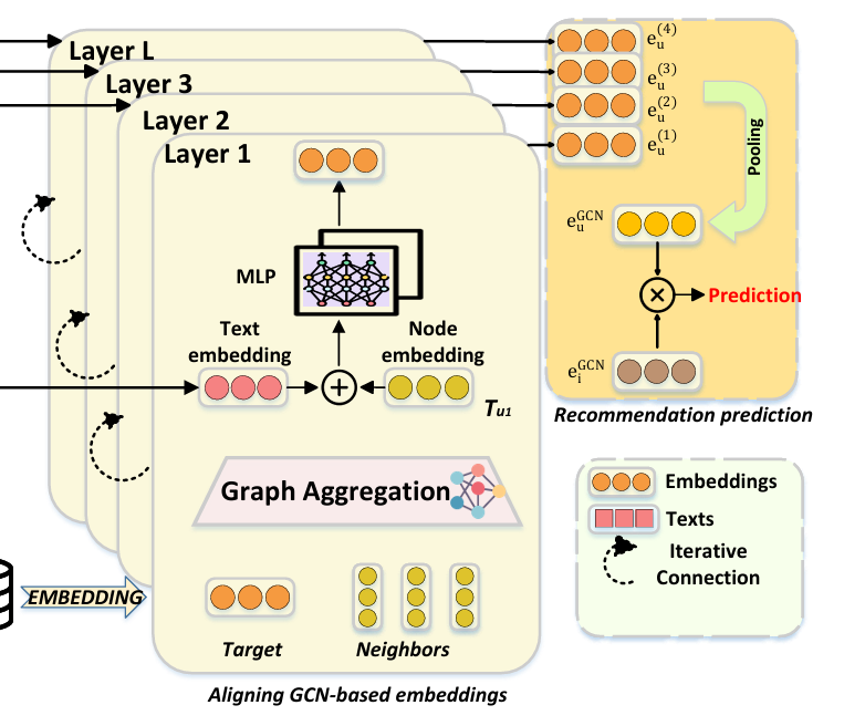 此模块旨在将经过GCN生成的目标节点的嵌入与目标节点的文本嵌入进行元素级相加再经过多层感知机MLP捕捉用户和项目嵌入之间的非线性关系,并处理来自不同来源的特征,将它们组合起来,生成更有效的特征表示。