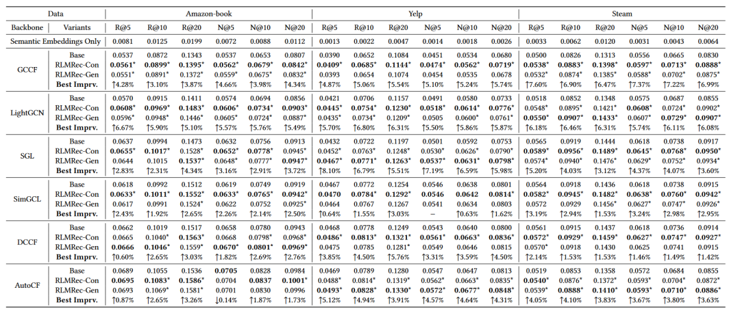 RLMRec在Amazon-book、Yelp、Steam等数据集上相对于其他方法有更好的效果