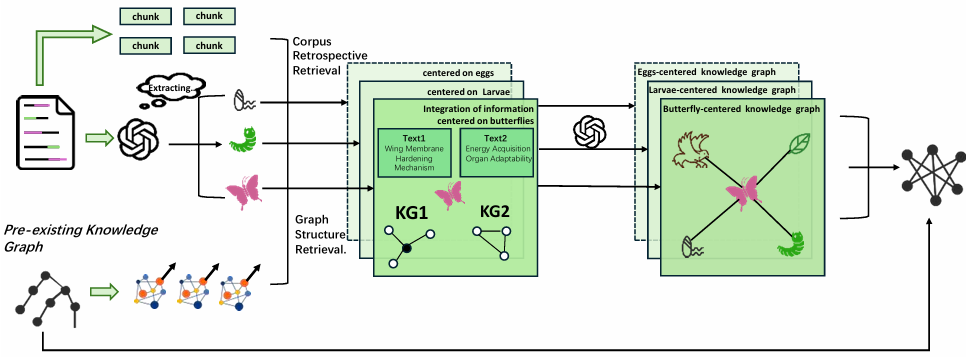 以“蝴蝶的生命周期”为例: RAKG 的命名实体识别模块检测到 23 个核心实体,其中“蝴蝶卵”“毛毛虫”和“成年蝴蝶”是中心实体。这些实体在文章中有密集的文本块,表明它们是关键概念。 以“成年蝴蝶”为例,RAKG 检索到描述其五个特征的专业文本块,并从原始知识图谱中检索到与“成年蝴蝶”相关的子图。 通过将这些文本块和子图整合后输入 LLM,RAKG 构建了以“成年蝴蝶”为中心的关系网络,形成了完整的子图。 最终,通过整合所有子图,RAKG 构建了一个系统化的知识图谱,清晰地展示了文章的核心概念及其相互关系。