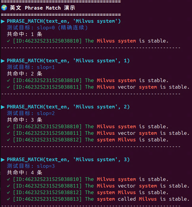 运行`phrase_match_logs_demo.py`我们来看实际效果: 02Phrase Match 是如何做到的?Phrase Match 将传统 BM25「基于词频统计」的检索思路,演进为「短语结构感知」的精准匹配, 如下图所示: 03中文 vs 英文 Phrase Match:实战小技巧很多人觉得 Phrase Match 在中文“效果不好”,其实在绝大多数情况下,是因为: 1.分词器没有设对(没用 `chinese` analyzer) 2.沿用英文的 slop 直觉,导致中文 slop 设得太小 在对中文进行 Phrase Match 时,`analyzer_params` 必须显式指定为 `"chinese"`: ```python#Chineseanalyzer(基于中文分词)schema.add_field(field_name="text_zh",datatype=DataType.VARCHAR,max_length=2000,enable_analyzer=True,enable_match=True,analyzer_params={"type":"chinese"},)````⚠ 关于中文 slop:它和英文“数值表现”并不一样(官方 [issue#45807](https://github.com/milvus-io/milvus/issues/45807) 有详细解释) 英文单词的 `positionLength = 1` 中文词的 `positionLength` 可能大于 1 👉 结果就是:要匹配同样结构的短语,中文通常需要更大的 slop,数值也更“稀疏”(例如 1、3、5、7…) 运行 `phrase_match_multilang_demo.py` 看看实际效果: