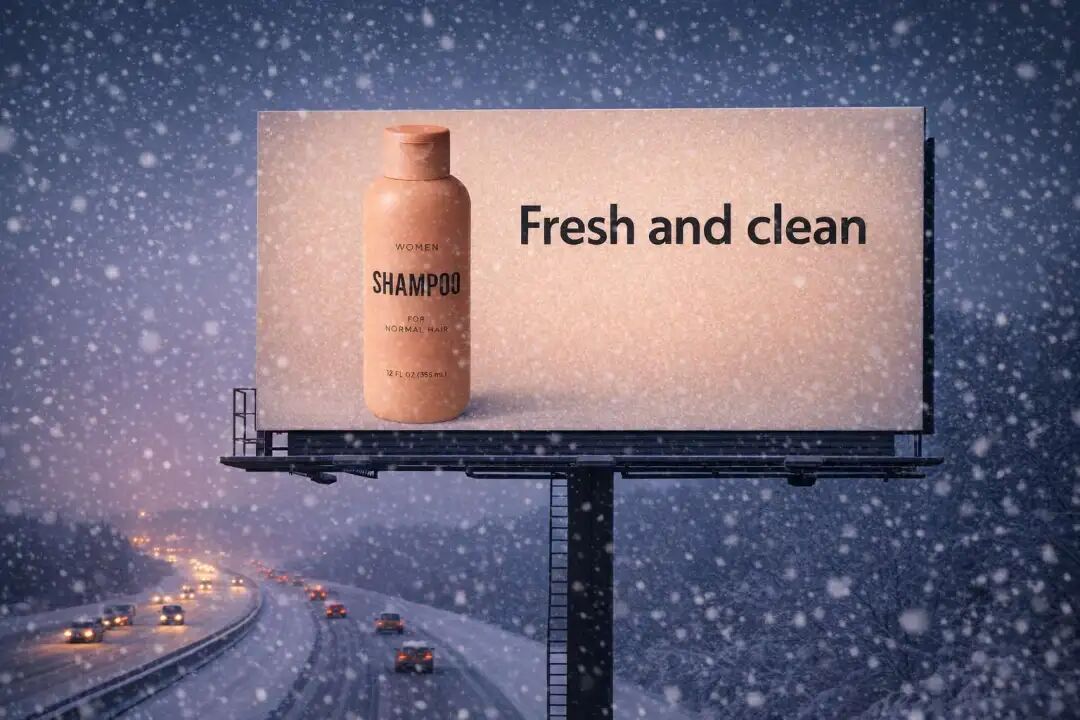 创建一个真实的广告牌效果图,展示洗发水在日落时分的高速公路场景中。